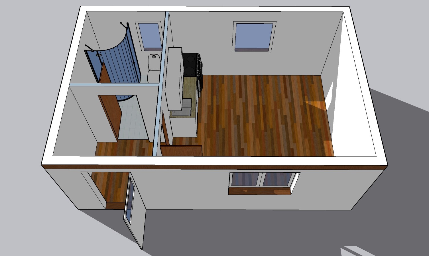 | Výbava: | Nový mobilheim, fasádní lepidlo a dřevo, sedlová střecha, vnitřní stěny sádrokarton a dřevěný obklad, strop dřevěný obklad, podlaha zátěžové lino, kuchyně, (dřez, digestoř, varná deska s troubou), koupelna (WC, umyvadlo, sprchový box, bojler 20l) |