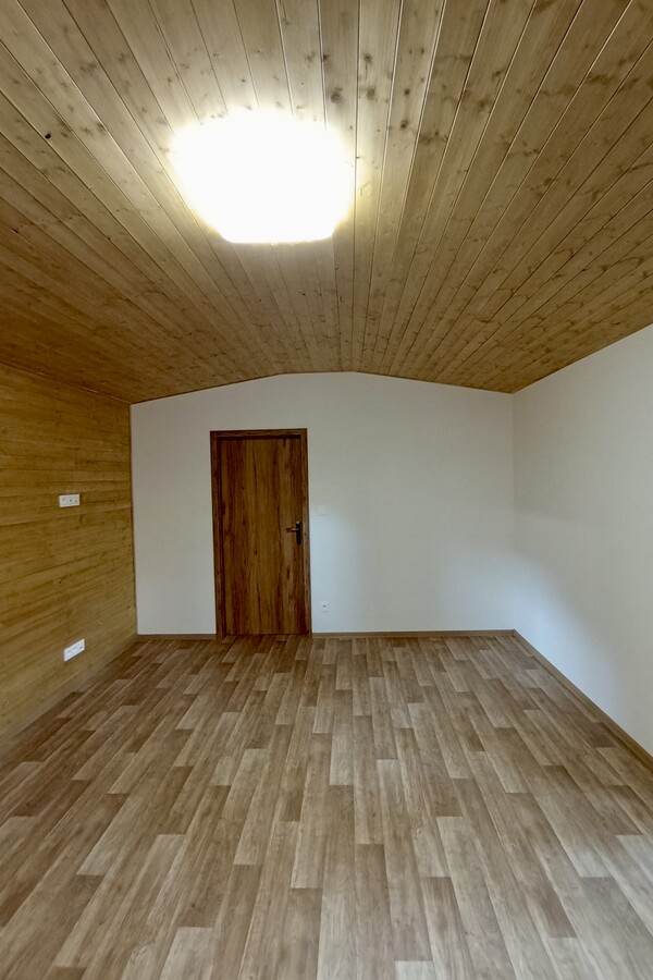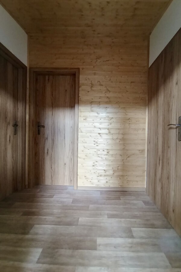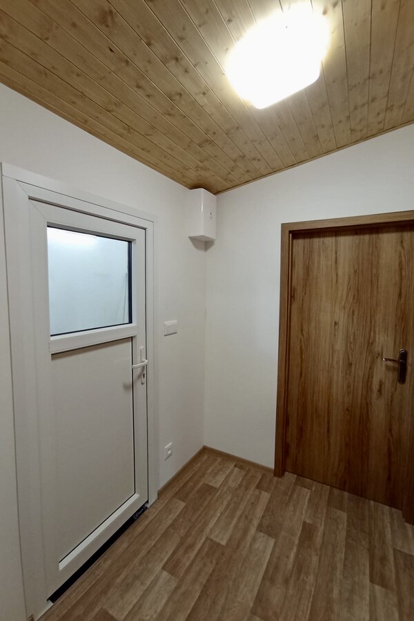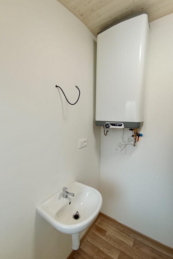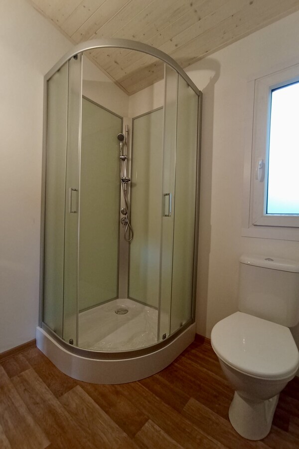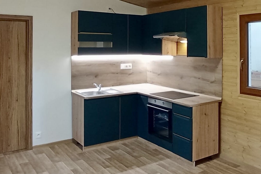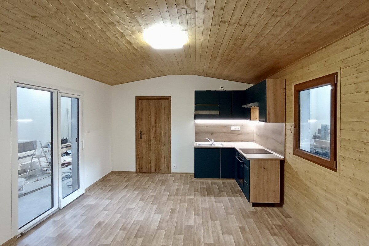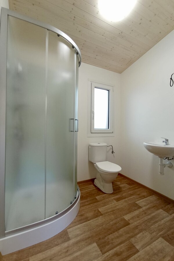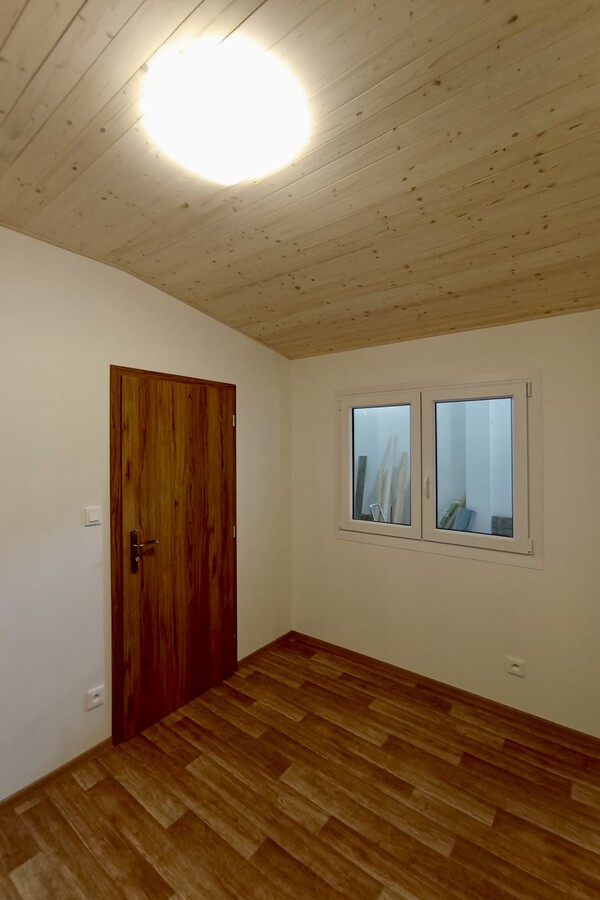 | Výbava: | Nový mobilheim, fasádní lepidlo s dřevěným obkladem, vnitřní stěny sádrokarton a dřevěný obklad, strop dřevěný obklad, kuchyně L, (dřez, digestoř, varná deska s troubou), koupelna (WC, umyvadlo, sprchový box, bojler 80l), síla vnějších stěn cca 24 cm, podlahy cca 15 cm, střechy cca 24 cm |